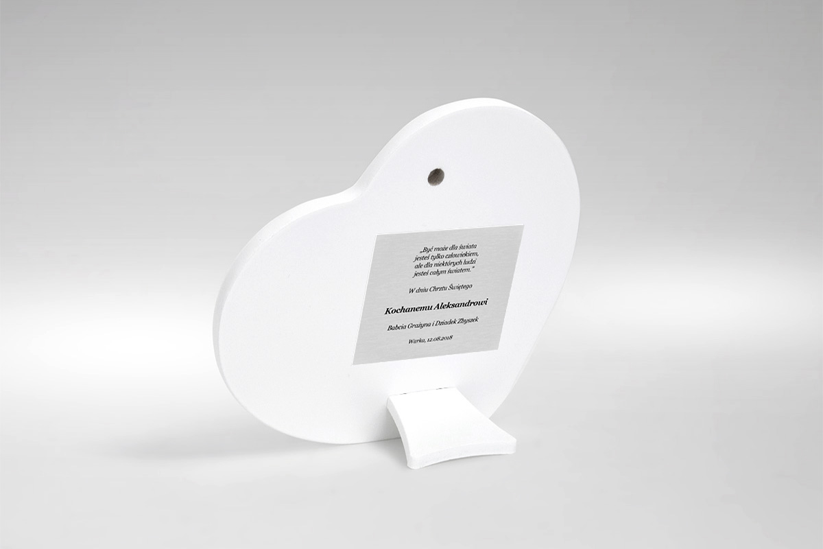 Nadaj pamiątce wartość sentymentalną - wzbogać ją o tabliczkę z indywidualną dedykacją. Tabliczka wykonana jest techniką grawertonu, co oznacza, że na cienkiej aluminiowej płytce zostaje nadrukowany wybrany przez Ciebie tekst. Technika grawertonu gwarantuje elegancki wygląd tabliczki oraz jej trwałość.