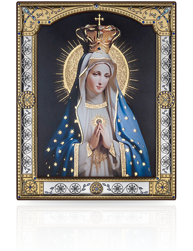 • Elegancka ikona Matki Bożej wykonana przez renomowaną włoską markę Cuore, łącząca w sobie duchową głębię i artystyczne piękno. Przedstawia Maryję w koronie, w niebieskim płaszczu ozdobionym złotymi gwiazdami – symbolu królowania i czystości. Wizerunek został umieszczony za szklaną szybką, co zapewnia ochronę i nadaje elegancki wygląd. Charakterystyczne złocenia umieszczone na zewnętrznej stronie szybki tworzą subtelny efekt przestrzenny, dzięki czemu obraz nabiera głębi i blasku. Ozdobna ramka w tonacji złota i srebra z misternym wzorem harmonijnie dopełnia wizerunek, podkreślając jego elegancję i precyzję wykonania. Ikona Matki Bożej to wyjątkowy prezent na uroczystości religijne, ślub, chrzest, I Komunię Świętą lub jako ozdoba i błogosławieństwo domu.