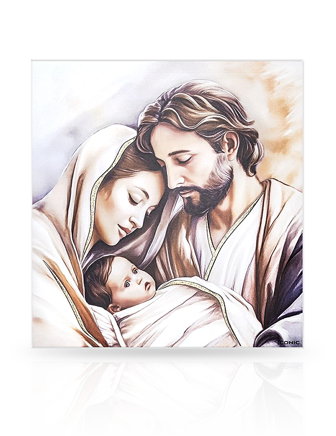 • Wizerunek Świętej Rodziny w kwadracie - pełna ciepła i delikatności scena, która symbolizuje miłość, opiekę i rodzinne więzi. Obrazek wykonany został na białym drewnie z zastosowaniem wysokiej jakości technologii druku, dzięki czemu oddaje subtelne przejścia barw i wyraźne detale. Złocone akcenty w obrzeżach szat dodają całości elegancji. Idealny jako prezent z okazji chrztu, komunii, ślubu lub jako wyjątkowa dekoracja wnętrza.